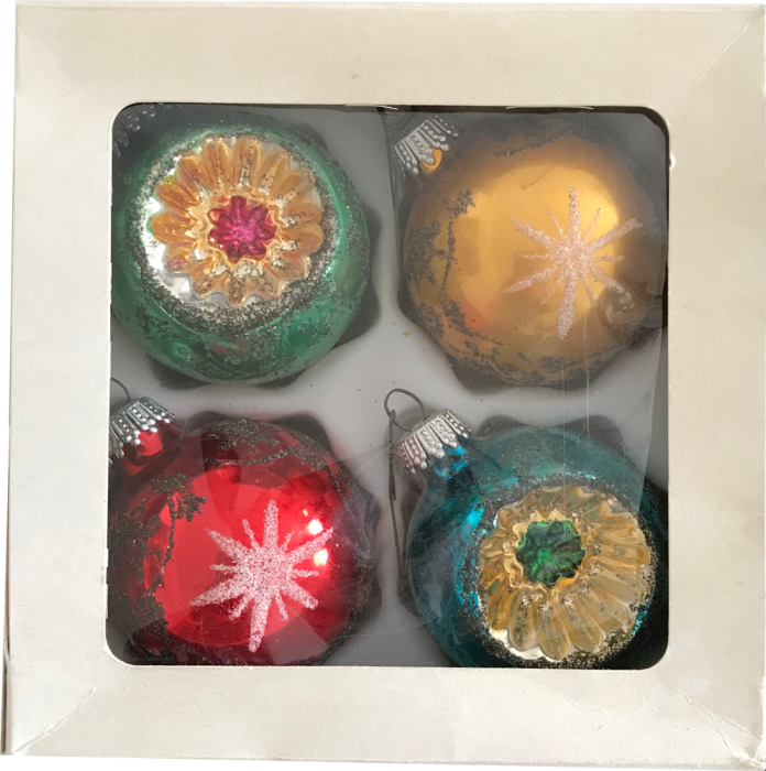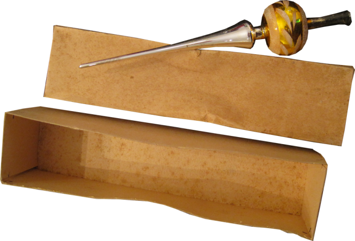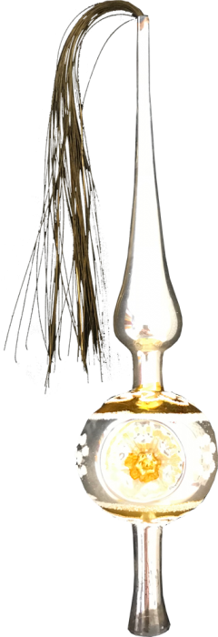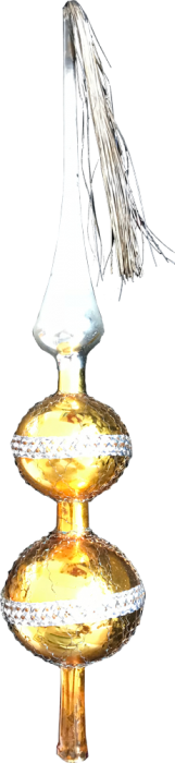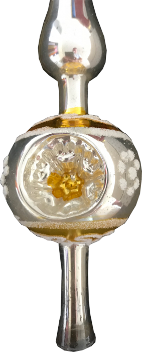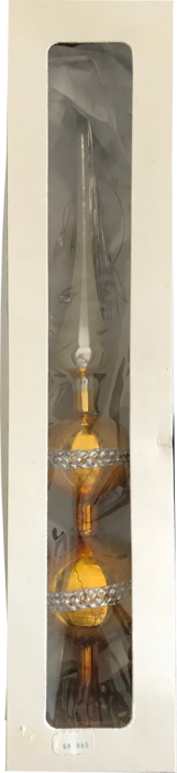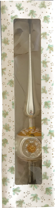 Alte Baumspitze, gelb , silber mit weißem Dekor. Höhe ca 26 cm Durchmesser ca. 5 cm Im Orginal Karton, Zustand gut mit gebrauchsspuren.