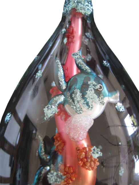 Exklusive Spitze in Form einer Aquariumsäule mit 4 Fischen im Inneren, Hülle transparentes Glas blau Getupft. ca. H: 47 cm, Durchmesser: 11 cm.